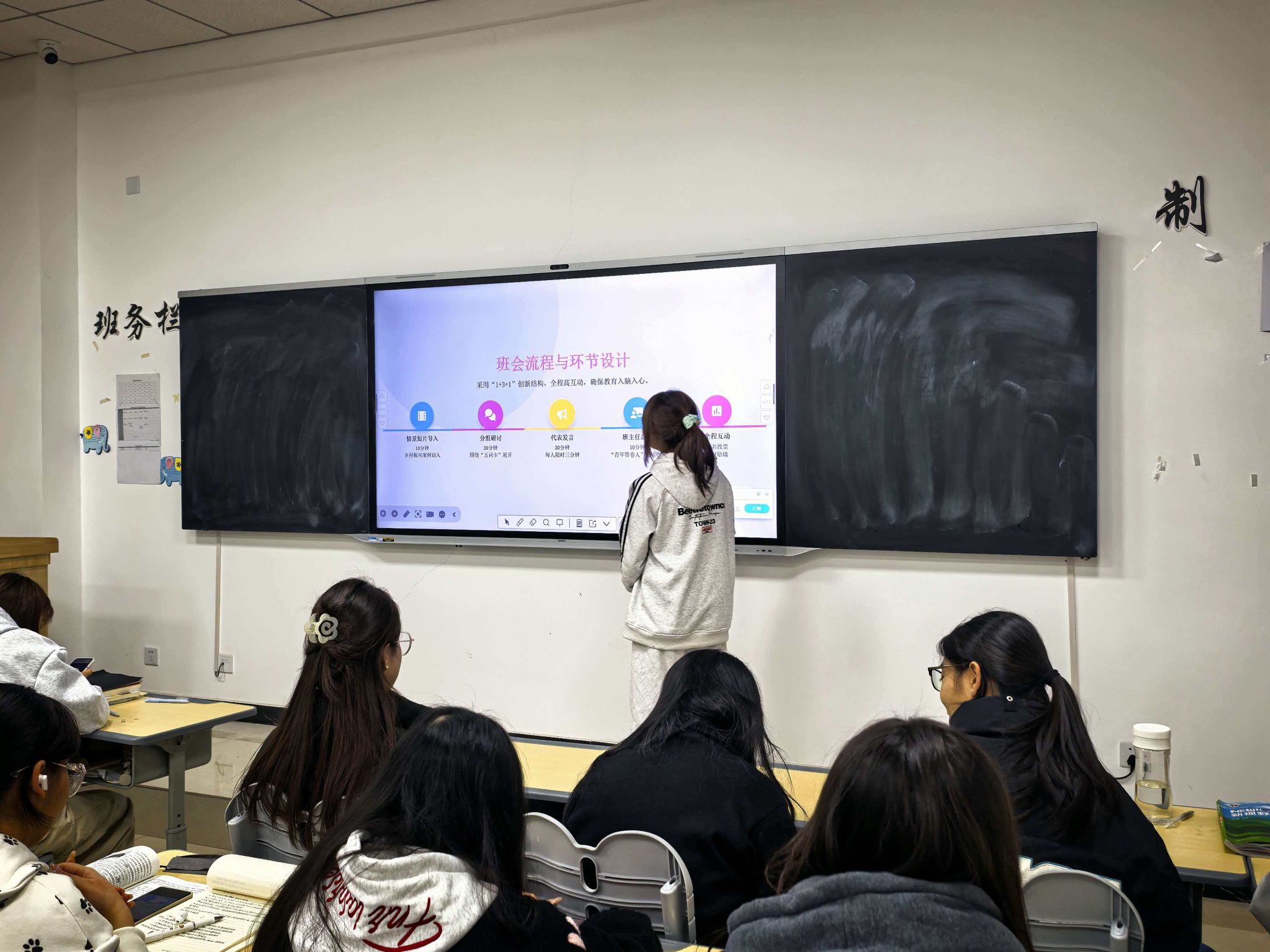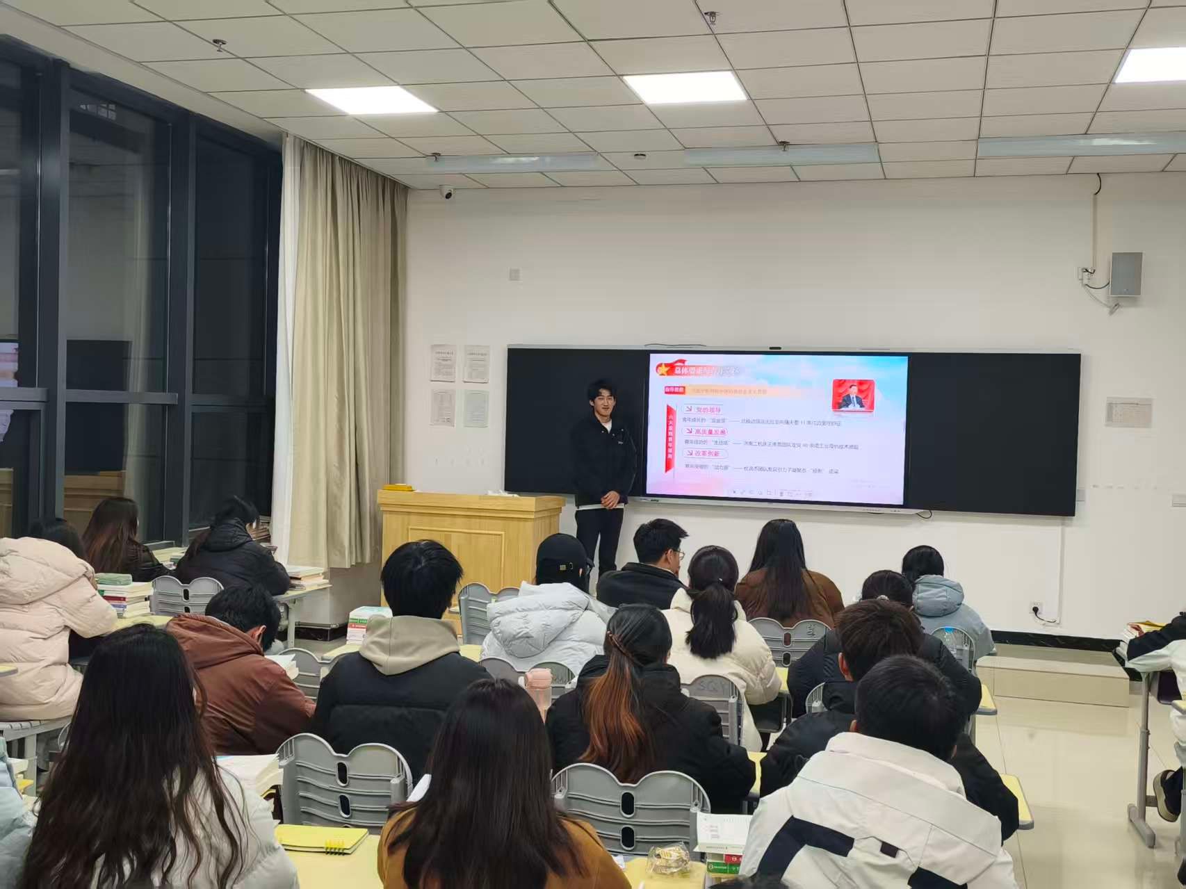 班会开展过程中,各班级牢牢把握核心内容,推动理论学习走深走实。一方面,聚焦教育强国建设与中国式现代化要义,通过领学党的创新理论、解读社会主义核心价值观等内容,引导学生深刻理解中国式现代化的中国特色与本质要求,筑牢思想根基;另一方面,结合党的二十届四中全会精神、习近平总书记给涉农高校师生的回信精神,组织学生围绕“理论学习如何转化为农村振兴和农业现代化具体行动”展开热烈讨论。各班学生结合财务管理专业特色,分享了运用专业知识助力乡村产业发展、农业产业投融资的思考;低年级学生畅谈学业规划与强国复兴的结合点,高年级学生则结合实习实践经历,讲述服务基层农业发展的感悟,现场交流氛围浓厚。