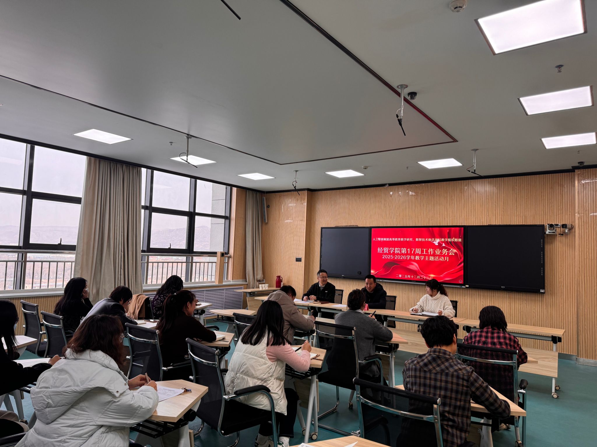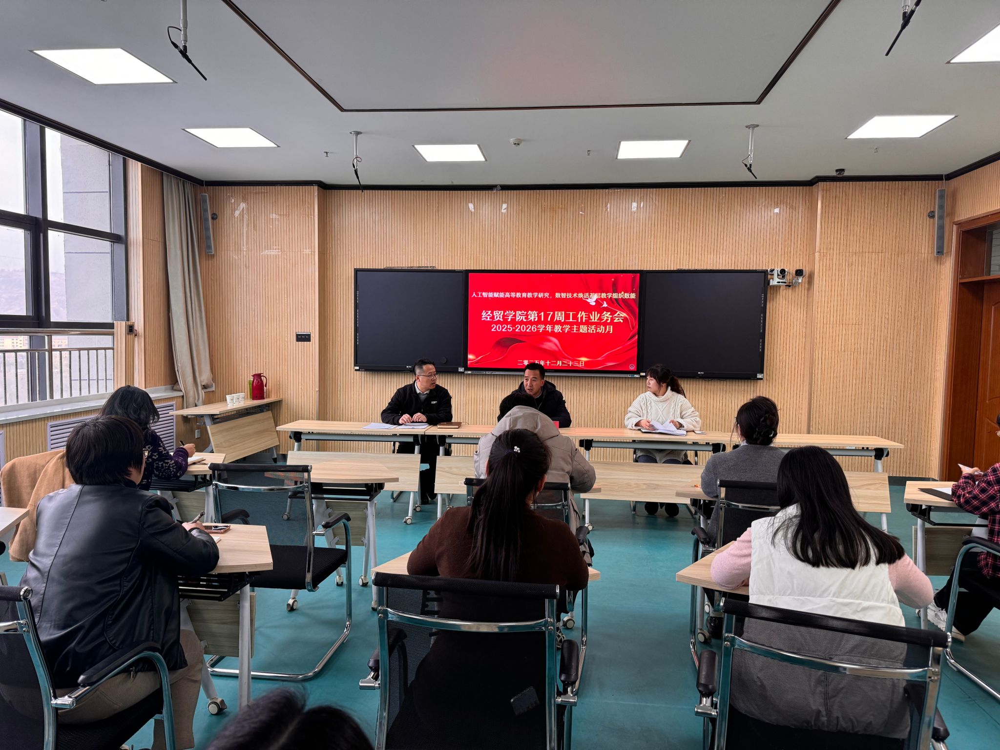 为深入学习贯彻二十届四中全会精神,统筹推进学期末各项工作,扎实备战职业院校技能大赛,12 月 23 日下午 16:30,定西职业技术学院经贸学院在北教学楼 808 会议室召开第 17 周工作业务会议。会议由经贸学院院长孙振华主持,定西职业技术学院副院长仲军莅临指导并讲话,经贸学院全体专兼职教师参加会议。