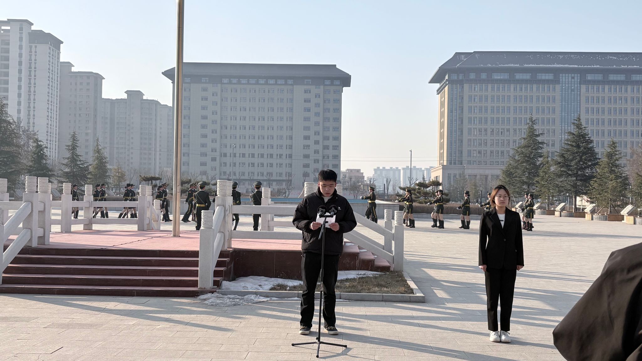 上午时分,升旗仪式正式拉开帷幕。伴随着激昂的出旗乐曲,国旗护卫队队员迈着整齐划一的步伐,昂首挺胸护送国旗走向升旗台,神情庄重而坚定。随后,《义勇军进行曲》奏响,鲜艳的五星红旗冉冉升起、迎风飘扬。全体师生肃立注目,高唱国歌,爱国之情与奋进之志在每个人心中激荡。